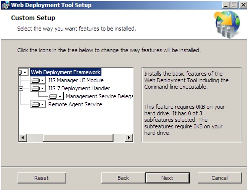 The above components install MSDeploy along with its management UI and the IIS 7 handler for managing deployment requests. The management service will be the actual service listening for requests. The Remote Agent Service is another MSDeploy option used mainly for command-prompt deployment but is not required for VS 2010 1-Click Publishing.