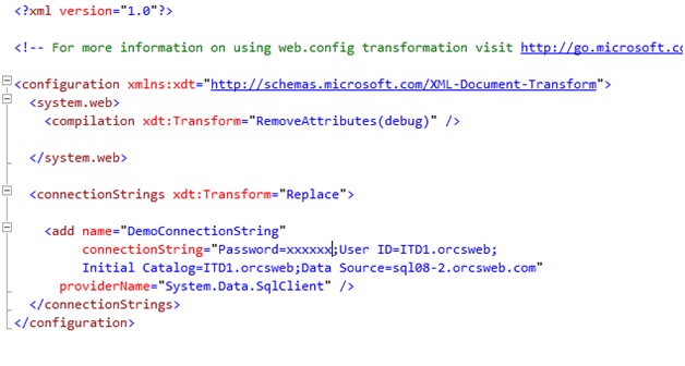 Here we are using XDT (xdt:Transform=”Replace”) to instruct VS 2010 to replace the development-time connection string available in web.config with the release (or production) time connection string available in the web.config.release. This is the connection string supplied by the hosting company. The final web.config file in the final package will contain the updated connection string.