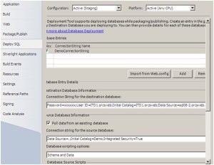 Now let’s set up VS to deploy our SQL database also…this solves the concern of deploying the database along with the application in a single click. Open the properties window of the project. You will find a new tab called Deploy SQL. In this tab set up the connection string of the development database which you want to deploy (you can make VS 2010 import this from the web.config file by clicking “Import from Web.config”) and then provide the destination URL where the database will be deployed. This will be the connection string provided to you by the hosting company. Instruct VS 2010 to include data while deploying and make it get schema and data…the below screen shot shows the configuration I used to deploy my application: