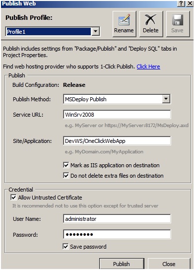 Notice that I have created a second profile for publishing. The settings are similar to the ones I used for hosting company’s profile; just note that in the Service URL I just supplied the name of the server to deploy to. This is the server I have configured MSDeploy service on; in this case my same dev machine…
