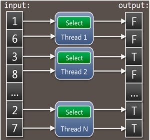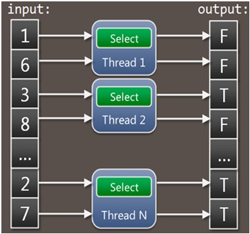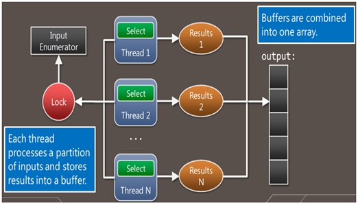 Think about it: we are using an enumerator from 0 to 200. However since we are using PLINQ and not LINQ; the partitioning itself is not serial. The work is divided into random parallel units; for example from 0 till 10 is assigned to thread A while from 11 till 30 is assigned to thread B and so on. Once a unit of work is done its output is immediately flushed back to the final result. That’s why the output is not arranged. The below image gives an indication about this: