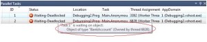 Let’s see how VS 2010 debugging support helps us identify such deadlocks. With the program running, fire the Parallel Tasks window. The window will clearly show you a case of deadlock. Not only that, it will specifically tell you what are the two threads causing the lock and how each thread is waiting a resource (in this case a Bank object) owned by the other thread: