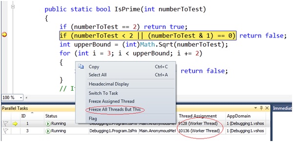 The above code uses PLINQ to print all prime numbers of a given range. There is nothing special about the parallel code itself, except that the IsPrime function has a logical error deliberately thrown inside it: on running the program you will notice that numbers 9, 15, and 25 are reported as prime numbers which is wrong. Now say you want to debug the IsPrime function and set a breakpoint inside it. Run the program and you will quickly notice the problem here: because multiple threads are executing, the debugging behavior is unclear as focus will switch from one thread to another as threads take turn hitting the break point.