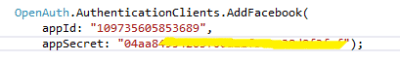 To add Facebook support to your support, uncomment the following lines and supply the App ID and App Secret; this prepares DotNetOpenAuth to communicate with Facebook as it now can identify itself using the id and gets authorized using the secret: