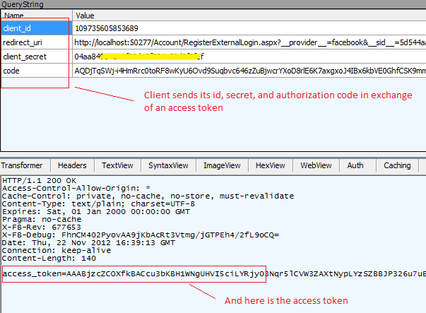 After authenticating to Facebook, the Client library has actually quietly – under the covers – gone over steps 1 and 2 discussed before (Facebook uses its own Facebook Connect protocol for both authentication and generating the OAuth 2.0 access token in a single step). Fire Fiddler and observe that the access token has been granted for the Client: