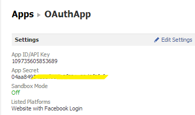 Before diving into the code, you need to register the Client (localhost web app in this case) with the API provider which for this example will be Facebook. To do this create a Facebook Application by visiting https://developers.facebook.com/. Once done you will be given an App ID and App Secret, these map directly to client_id and client_password discussed before:
