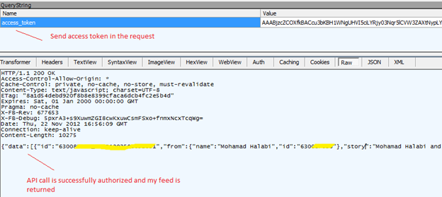 Now, you can use the access token to make the API request, as shown before; and here is the Fiddler data again:
