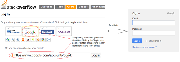 To clarify this, Google for example – as far as I know – does not give its users a fixed Claimed Identifier to use. Instead users supply a generic OP Identifier which then guides users into selecting their specific identifiers. You see this in effect when you see the button “Sign In using Google” in Relying Parties sites. MyOpenID on another hand gives its users their specific Claimed Identifiers to log in to relying parties (the “Sign In using Yahoo” button might also be used).