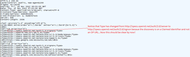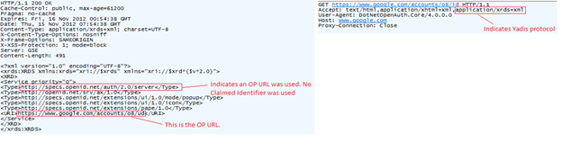 Next, because the identifier supplied is a URL, Yadis discovery starts and the web application (Relying Party) gets back an XRDS document. Below you see the request and the response: