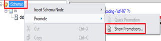 Now lets examine the first method, which is using BizTalk Editor. Using the BizTalk Editor, you can create both Property and Distinguished fields. Distinguished fields are straightforward; you just right click the schema node and select show promotions: