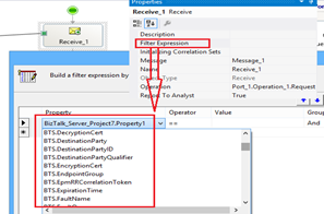 In addition, you can further filter the receive conditions, by using the Filter property of the Receive Shape. Here you can select the property fields to filter on:
