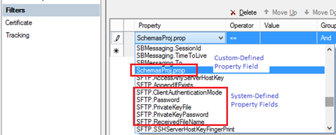 And finally, when you create a physical send port in the admin console, you can set filter expressions to create the subscription for this port. You can select the system property fields as well as any custom defined property fields:
