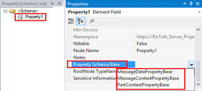 - MessageDataPropertyBase indicates that a property has its value from the message payload, such as OrderID. Such properties are promoted using custom property schemas, and the Property Schema Base property is set to MessageDataPropertyBase – which is also the default value.