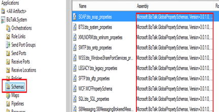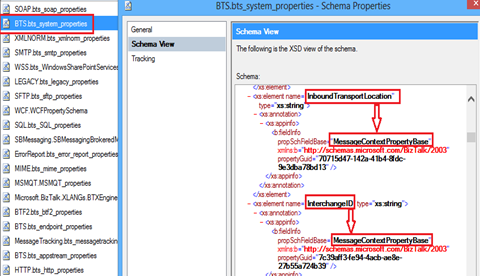 As for system property schemas, if you open any of those from the administration console, you will see that as expected all properties have their Property Schema Base set to MessageContextPropertyBase: