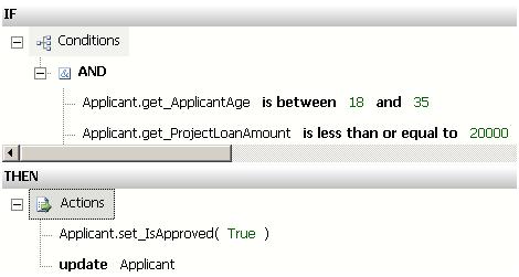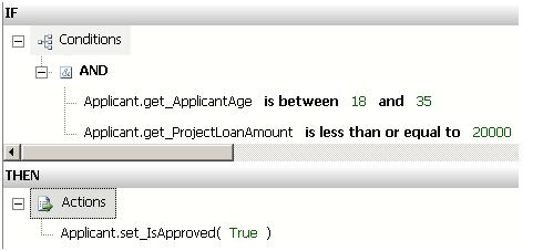 BusinessModel.Applicant) has been asserted into the engine. Recall that assertion means that the fact is now available for processing by the BRE. - The condition of Rule1 is evaluated. The left operand gets its value from the fact data and is evaluated against the right operand. In this case, the test result is true.