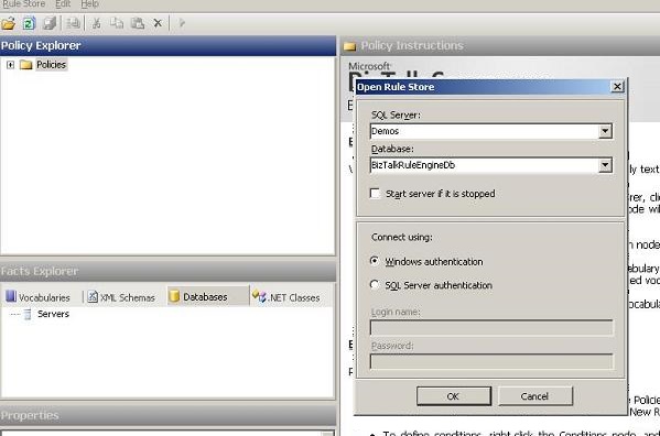 Open the Business Rule Composer. You will now get the UI which we will examine as we go on. One thing to note initially is that you can select the server (database) to which the composer is connecting. The database name is “BizTalkRuleEngineDb”. The window shown below allows you to specify the database server name: