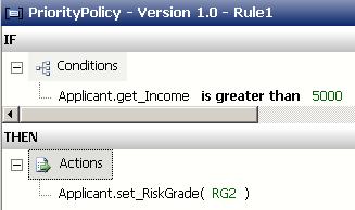 Now, go to the “IF” window, right click and select “Predicates GreaterThan”. In the resulting expression, drag the “get_Income” fact data into the argument1 placeholder and type “5000” into the argument2 placeholder. In the “THEN” window, drag the set_RiskGrade fact data into the “Actions” node. Type “RG2” into the set accessor. The final rule is shown below: