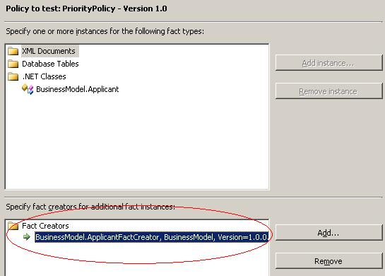 Now, everything we have done so far will come together. First, save your policy by right clicking on the version node and selecting Save. Recall that this will still allow you to edit your policy. Now, right click again on the version node and select “Test Policy…”. From the window opened, we now need to select the Fact Creator which we will use for testing. Recall that previously, we have created a class called ApplicantFactCreator which implements “IFactCreator”. This class creates a fact (applicant) for the sole purpose of being used for testing by the composer. Also, recall that we have deployed the DLL (which contains the fact and the fact creator) into the GAC. Now, in the fact creator portion of the window, select the “Add…” button and select the DLL from the GAC; the fact creator will be detected (since it implements IFactCreator) and listed, select it. The final view will be as follows: