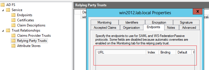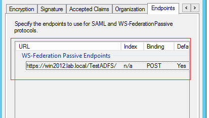 Anyway, fixing the FederationMetadata.xml file to use https, solved the issue. Now go back to ADFS console and update the relying party configuration. This time you will see the endpoint correctly defined: